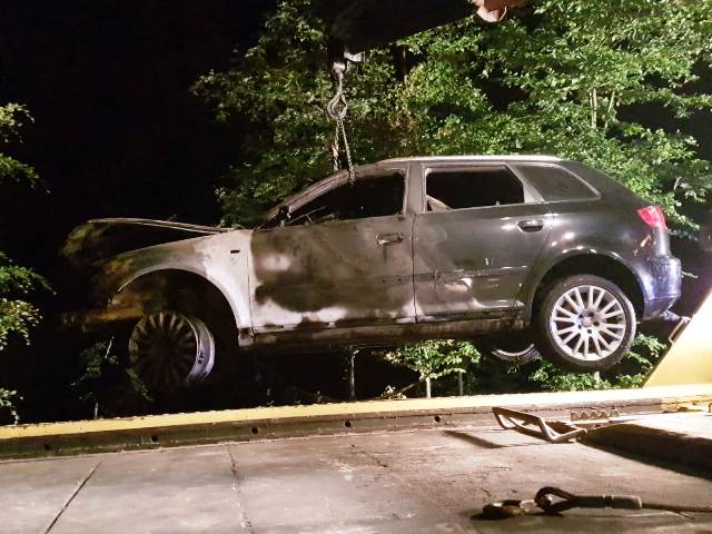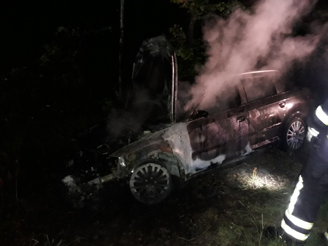 ein PKW - vermutlich nachdem er von der Straße abgekommen war - im Vollbrand.